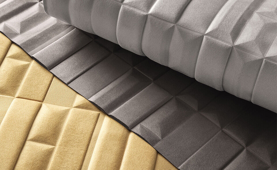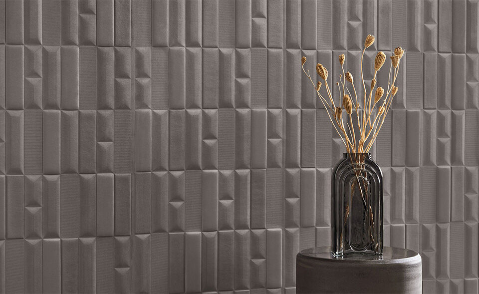 Une collection inspirée des carreaux de céramiques contemporains, ciselés aux multiples formes et facettes, pour capter et jouer avec la lumière, créant un décor sans cesse renouvelé. Associé à une suédine velouté, ce décor 3D se part d’une matité légèrement soyeuse, sourde et enveloppante. Polyform Eos Prism est une collection sophistiquée au décor tridimensionnel, inspirée du rythme des carreaux de faïence intemporels aux formats originels. Une mosaïque constituée de 6 motifs aux épaisseurs variables, dont chaque carreau est soigneusement disposé pour concevoir un décor aléatoire équilibré et riche de mouvements, accentué par des jeux d’angles dont l’accroche lumière révèle les multiples intensités de couleurs. Déclinée dans un nuancier de 9 teintes naturelles délicatement pigmentées, réhaussé de 2 couleurs tendances : un terracotta pour une ambiance chaleureuse, un miel tendre et lumineux. Les tonalités sont adoucies par la finition délicatement nacrée de la suédine gaufrée au toucher soyeux.