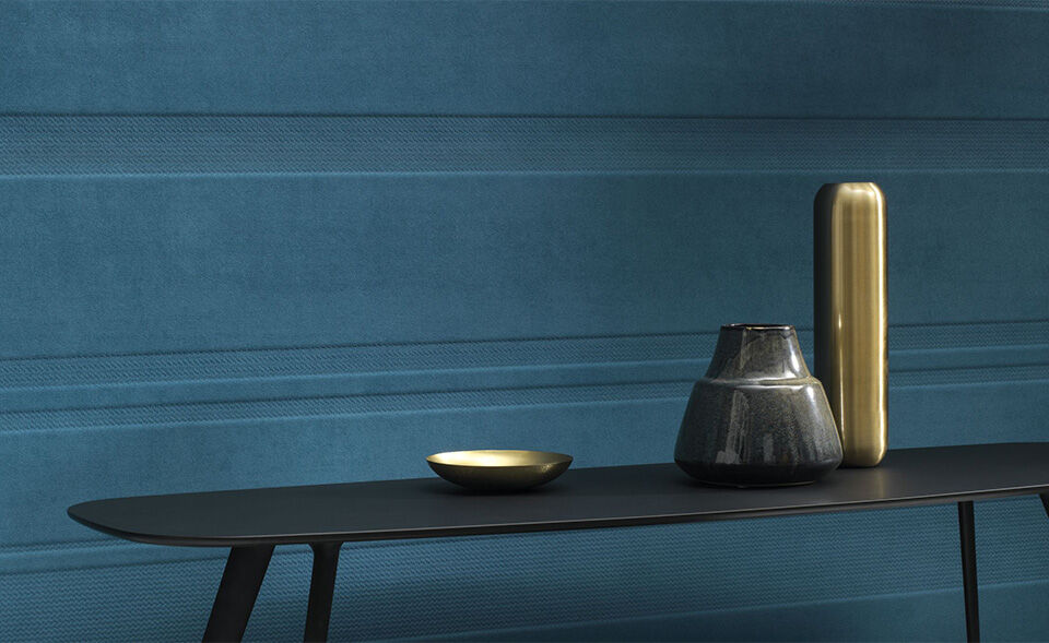 Un revêtement mural acoustique d’exception. Sous l’effet combiné de la compression et de la chaleur, le revêtement acoustique EOS souple et épais prend forme, créant un décor en 3 dimensions. Cet ennoblissement appelé molding réinvente ainsi la surface murale révélant des formes et décors jusqu’alors réservés aux matériaux d’agencement. Ton sur ton et décliné dans 7 tonalités, le décor Vertigo rythmé de rayures bayadères reste sobre, calme et facile à coordonner, tout en signant la décoration de l’espace. L’accroche lumière, naturelle ou artificielle, révèle différemment le motif selon son exposition ou son intensité, créant de multiples tableaux muraux. Le toucher et l'accroche lumière de la suédine subliment les couleurs d’un rendu mat profond et velouté, accentuant l'impression de confort.