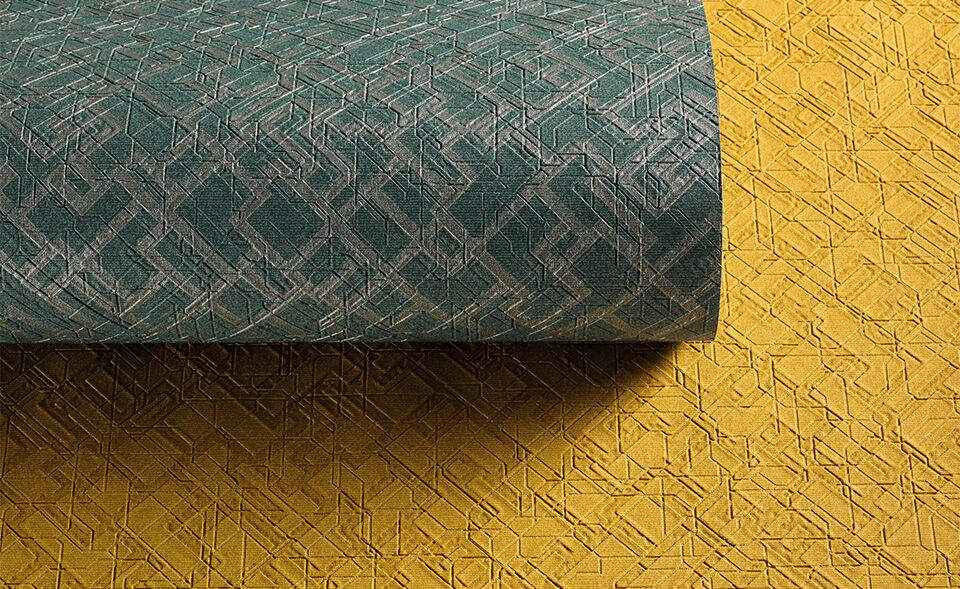 Dédale, c’est la création d’un faux-uni audacieux dessinant un labyrinthe d’entrelacs contemporains, décliné dans deux finitions : un ennoblissement métallisé sublimant la structure ou une impression mat ton sur ton. Ce décor rythmé crée une atmosphère précieuse, tout en subtilité. Dans les tonalités mats, ce revêtement révèle un aspect velouté et enveloppant. Alors que rehaussé de contrastes métallisés patinés, sa structure accroche la lumière et le motif se pare d’une nouvelle profondeur et d’un caractère affirmé. Ce motif architecturé explore une palette de 23 nuances élégantes, tout en raffinement : colorée, chatoyante et lumineuse, elle est composée de 18 teintes mates veloutées, revisitant la couleur miel ou le kaki naturellement chaleureux. Enrichi de 5 décors métallisés aux tonalités profondes, dont un bleu de Prusse ou encore un brun Terre d’Ombre, rehaussés de leur éclat métallisé.