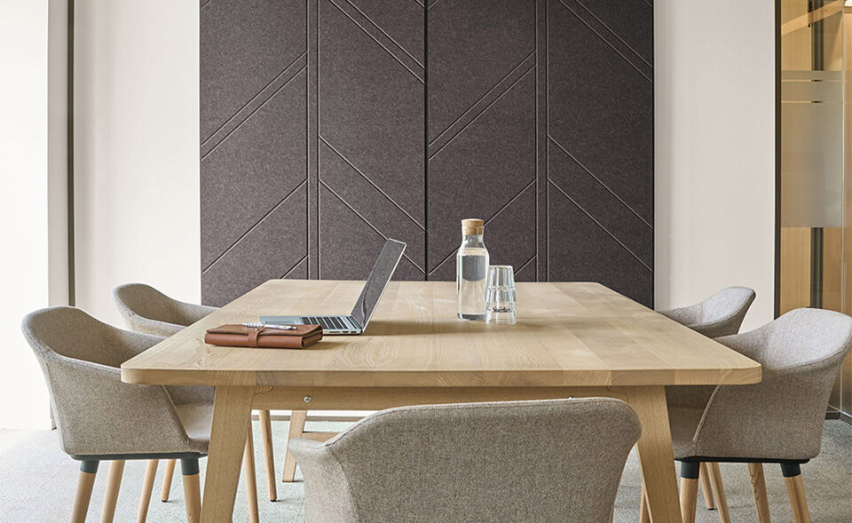 An innovative aesthetic design without a steel frame, made from materials with recycled content: the compact PET acoustic felt contains 60% recycled polyester, with 135,000 plastic bottles repurposed in 2023.